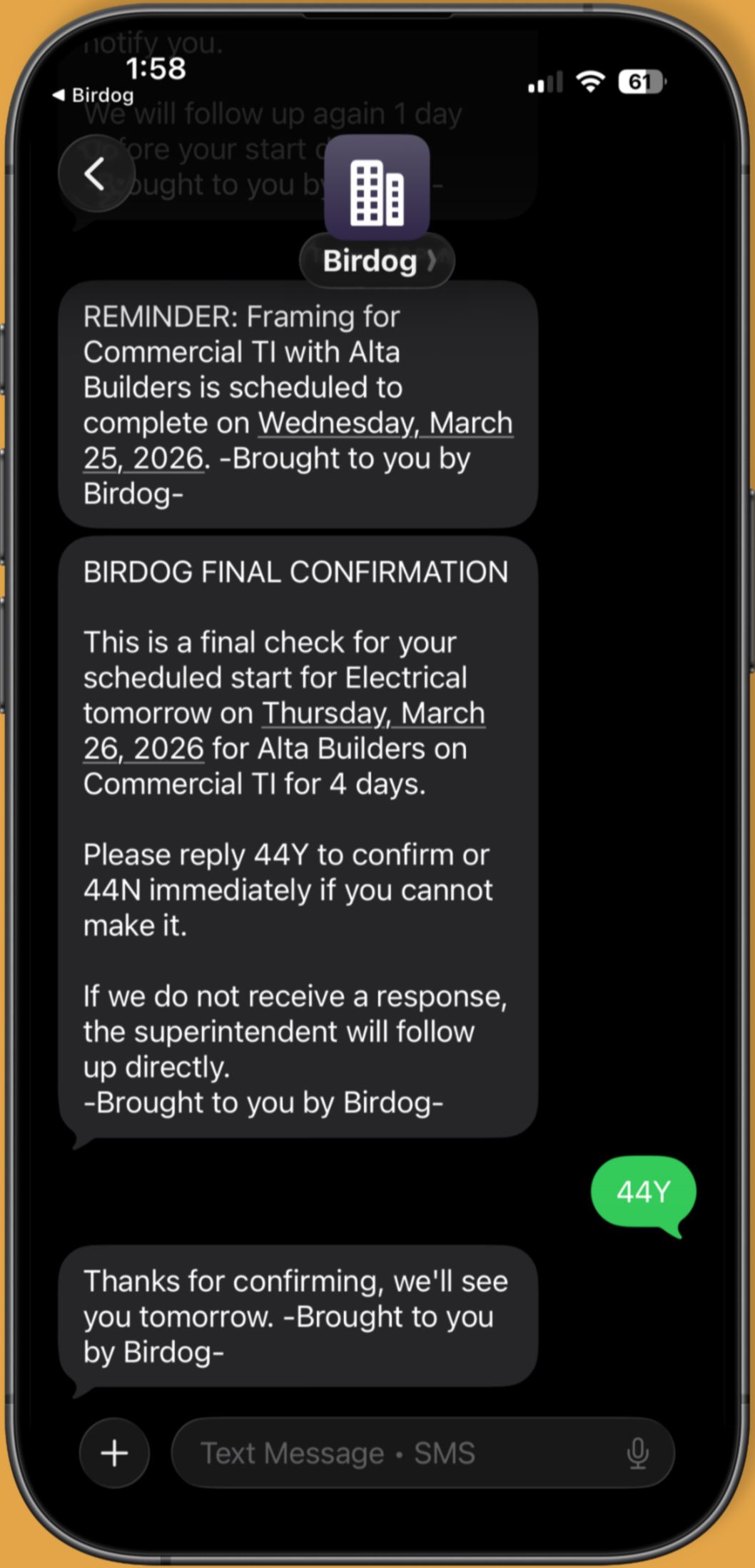 Birdog is a contractor scheduling app that helps construction teams automate reminders and confirm subcontractor availability by text.