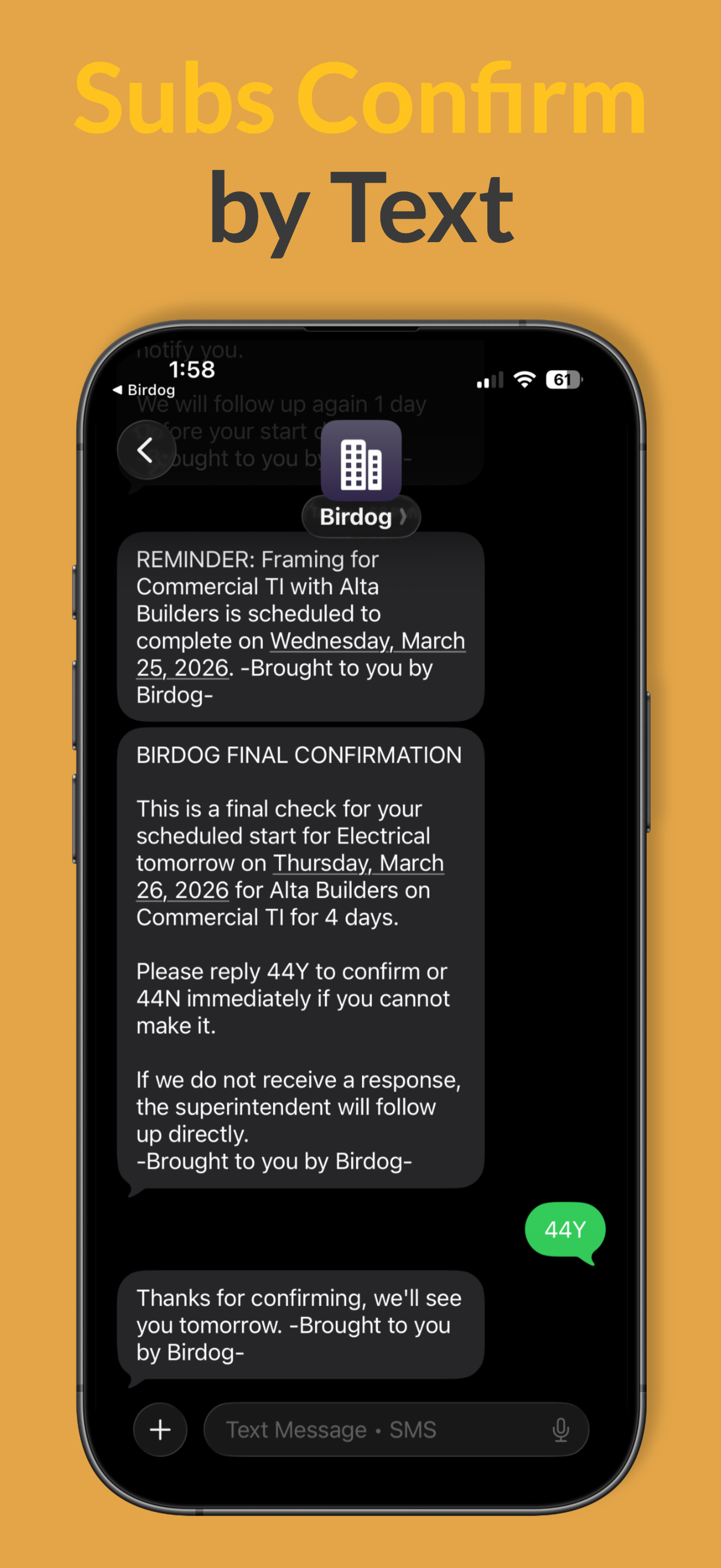 Birdog is a contractor scheduling app that helps construction teams automate reminders and confirm subcontractor availability by text.